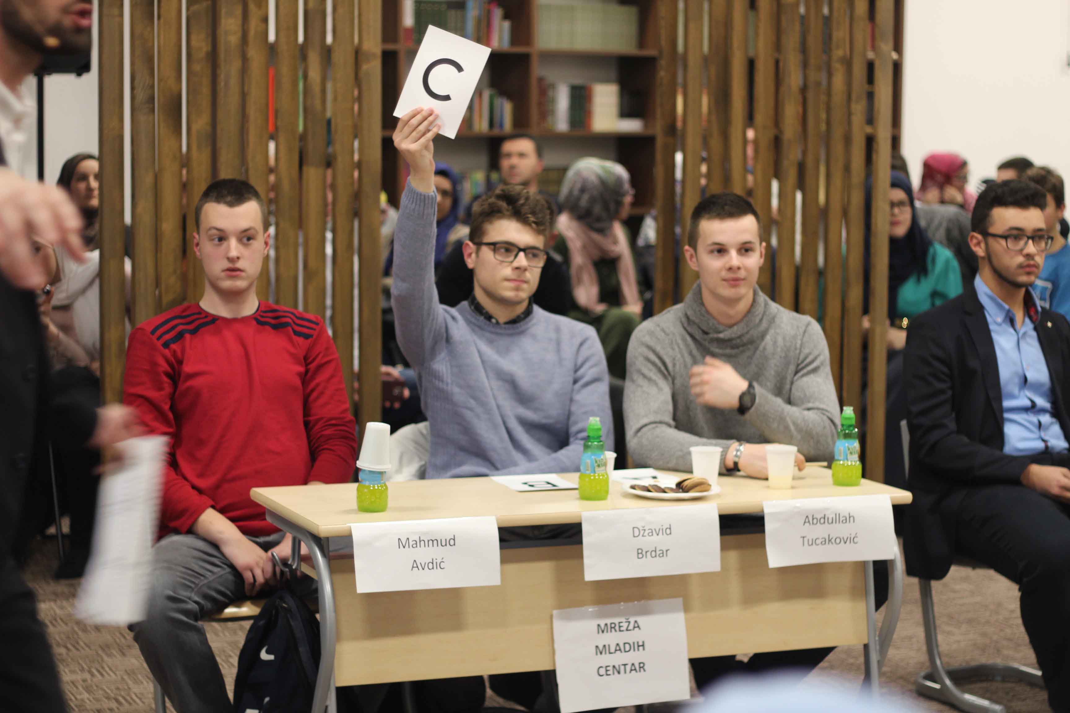 Kviz je završen rezultatom: Mreža mladih Ilidža, prvo mjesto. (Ali Drkić, Amra Musić, Amina Alić)